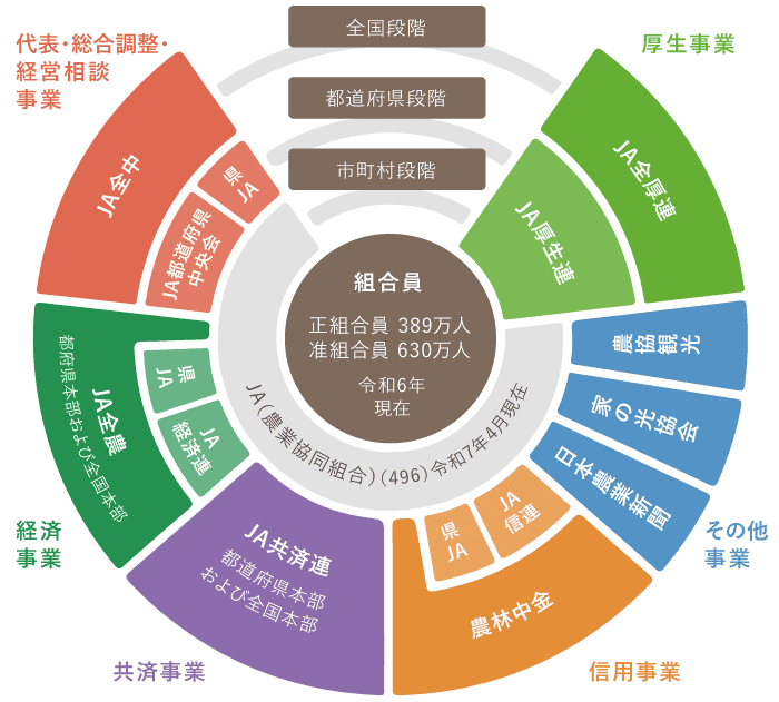 そこで、効率的な事業展開をはかるため、指導・経済・信用・共済などの事業ごとに、 JAとJA連合会等による事業組織が形づくられ「JAグループ」として活動しています。